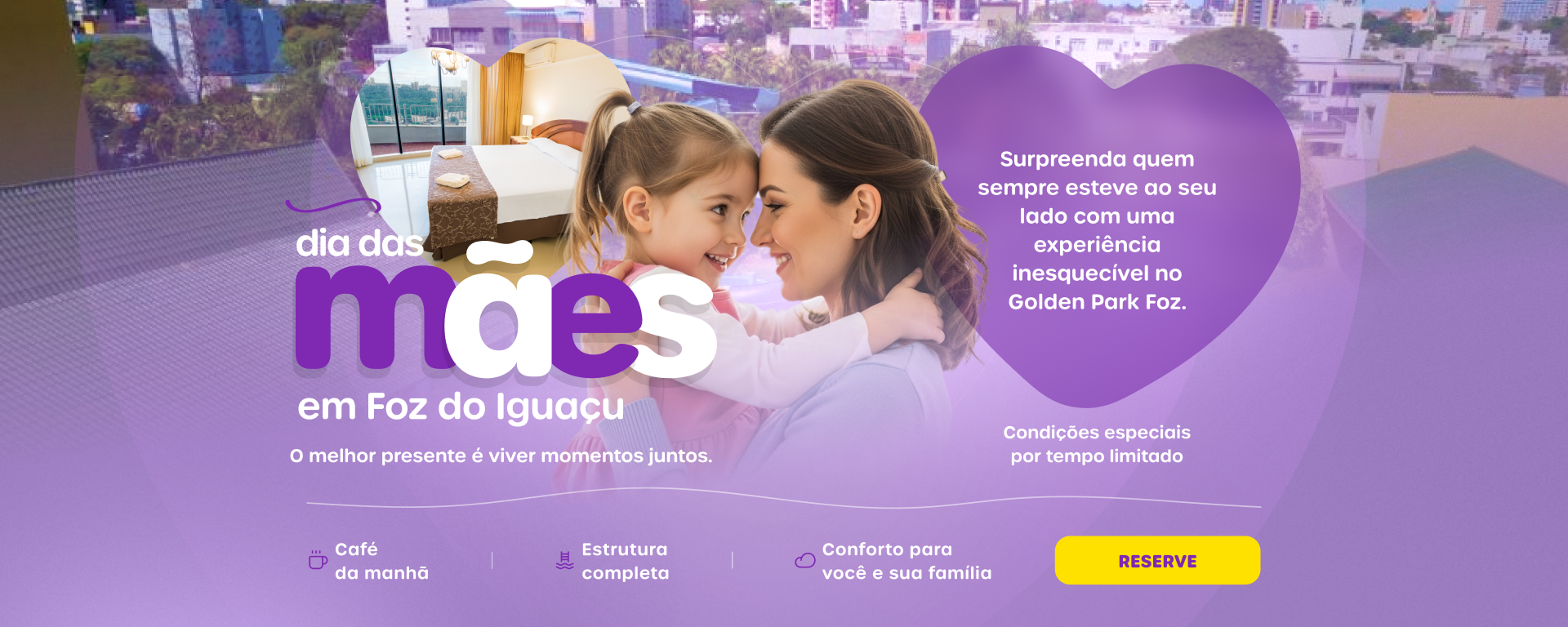Foz do Iguaçu é o cenário perfeito para celebrar: natureza, tranquilidade e dias especiais em família. E no Golden Park Foz, cada detalhe é pensado para proporcionar conforto, lazer e momentos únicos nessa data tão especial.