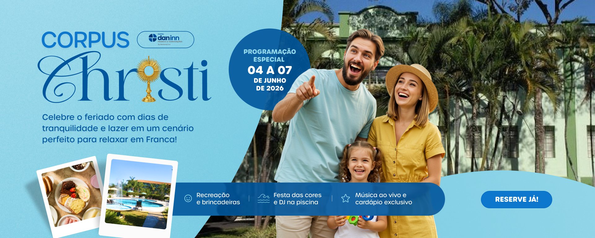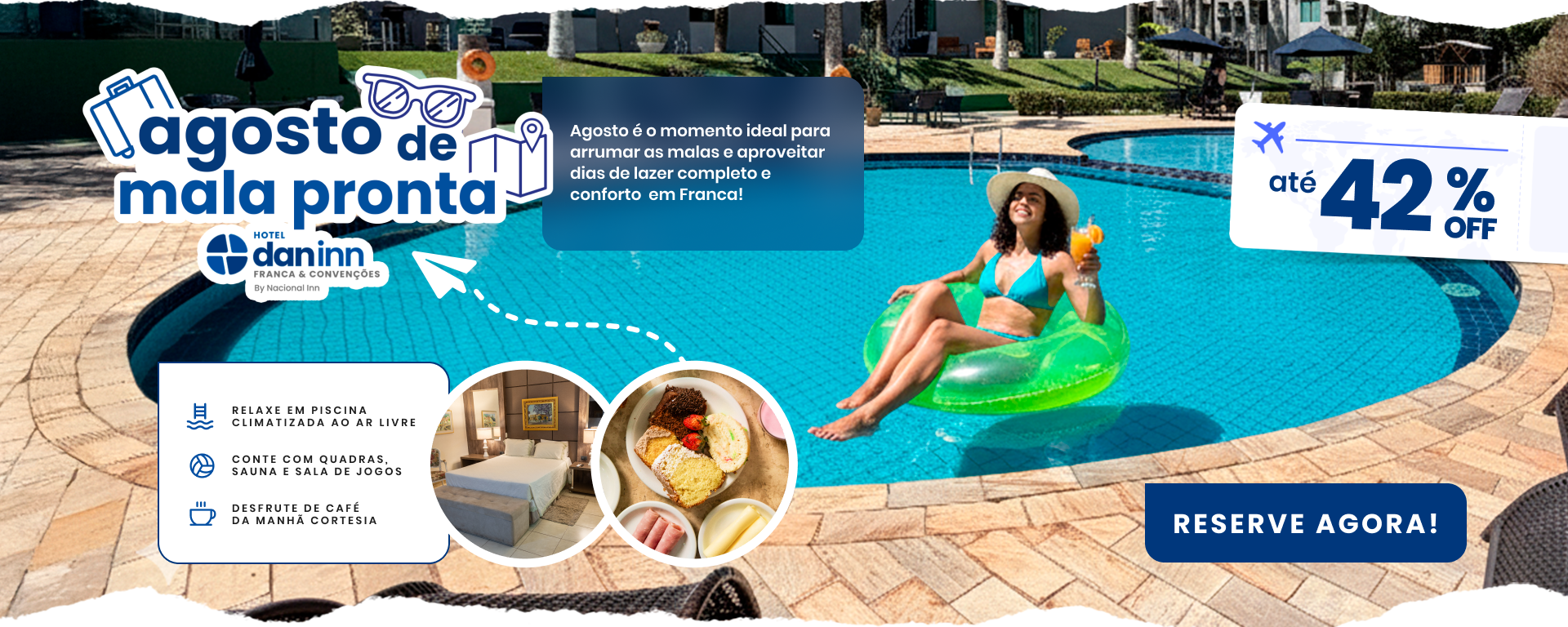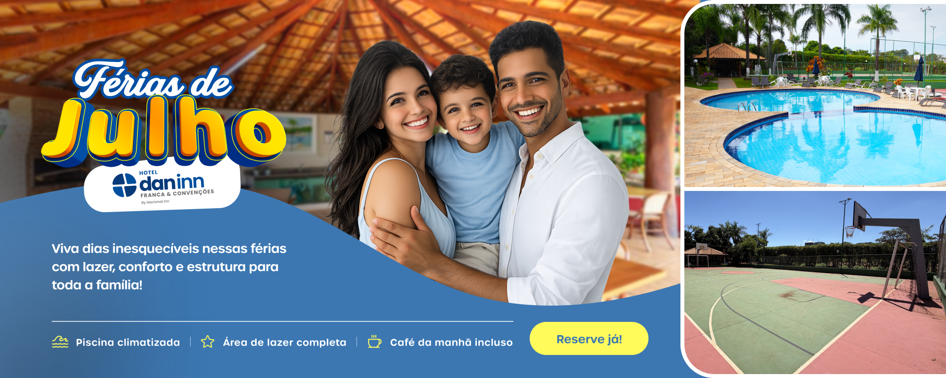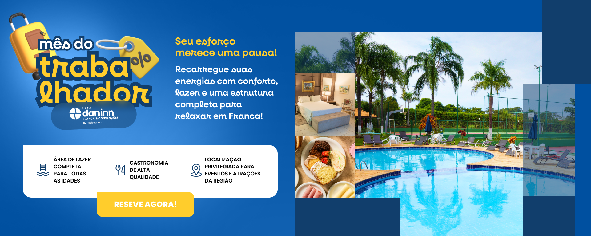 Encontre no Dan Inn Franca & Convenções tudo o que você precisa para uma experiência completa de conforto e conveniência, seja em uma viagem de lazer ou de negócios. Aqui você tem acomodações sofisticadas, aconchegantes e acessíveis, uma ampla área externa com piscina, sauna, quadras e redário, onde pode descansar com tranquilidade e aproveitar momentos de lazer, além de espaços versáteis para a realização de eventos.