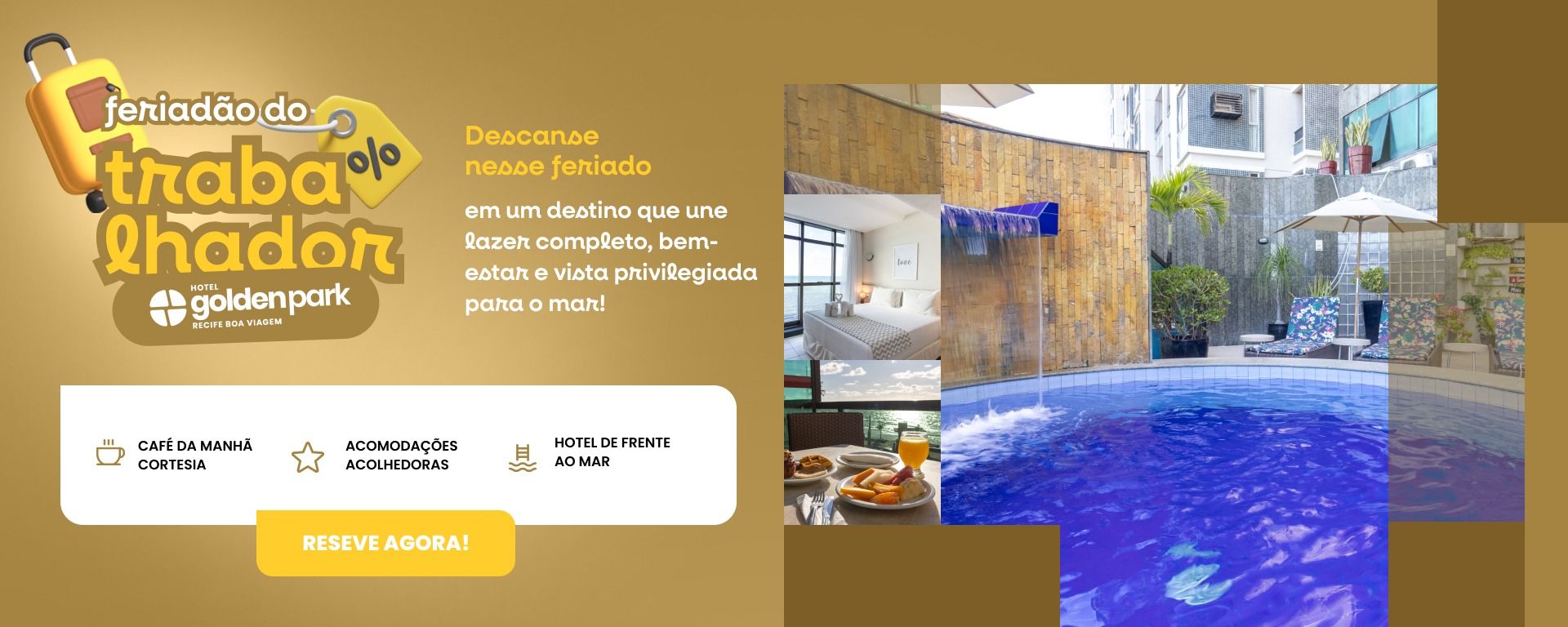 O café da manhã no Golden Park Recife Boa Viagem é cortesia para os hóspedes. São servidos diversos itens como bebidas quentes, sucos, pães, cereais, manteiga, laticínios, frios, frutas, bolos e doces. O restaurante é exclusivo para o café da manhã. Já para um lanche rápido durante a tarde ou à noite temos a nossa loja de conveniência funcionando durante 24 horas.