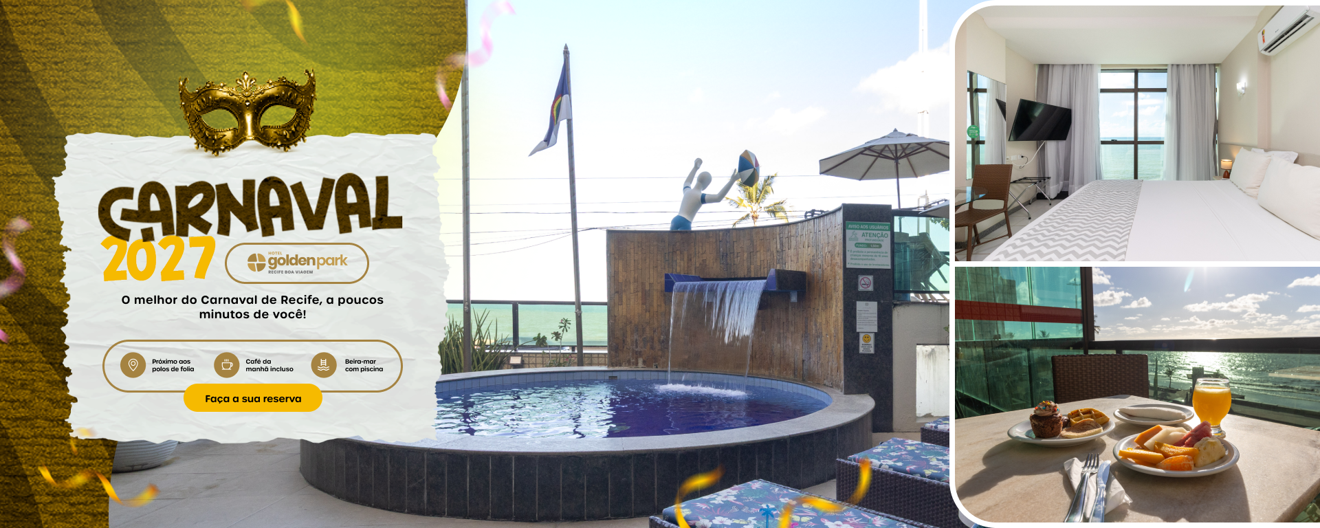 O café da manhã no Golden Park Recife Boa Viagem é cortesia para os hóspedes. São servidos diversos itens como bebidas quentes, sucos, pães, cereais, manteiga, laticínios, frios, frutas, bolos e doces. O restaurante é exclusivo para o café da manhã. Já para um lanche rápido durante a tarde ou à noite temos a nossa loja de conveniência funcionando durante 24 horas.