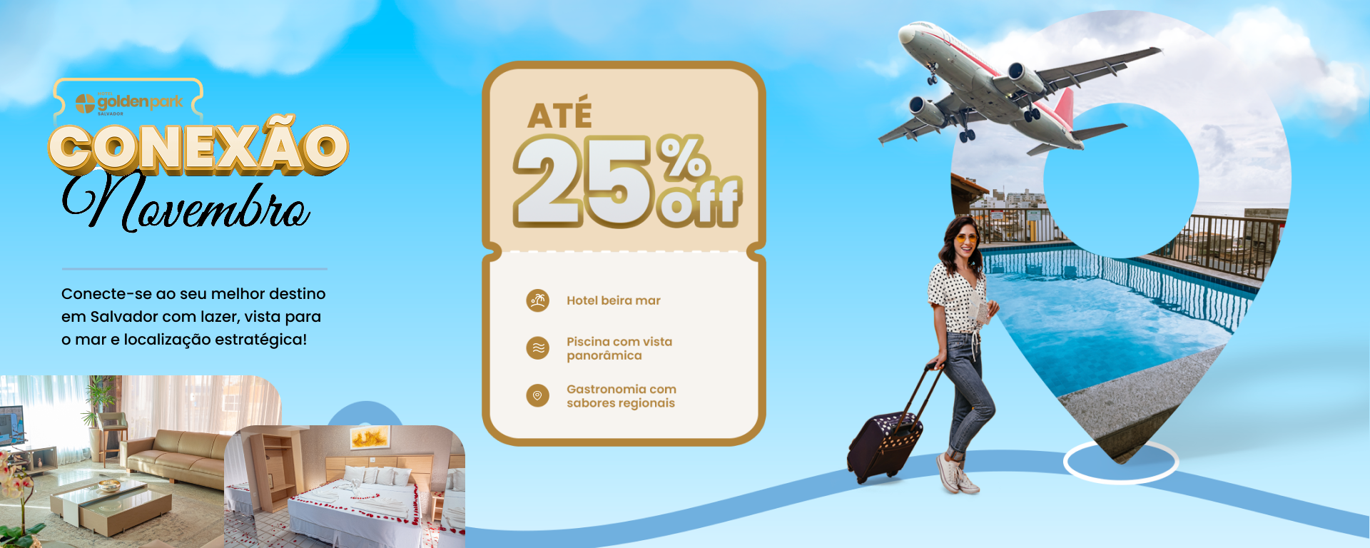 Viva dias de sol, mar e bem-estar no Golden Park Salvador. De frente para a praia, o hotel combina conforto, hospitalidade e uma localização privilegiada que coloca você perto das principais atrações da cidade. O destino ideal para relaxar, se inspirar e aproveitar cada momento com vista para o oceano.