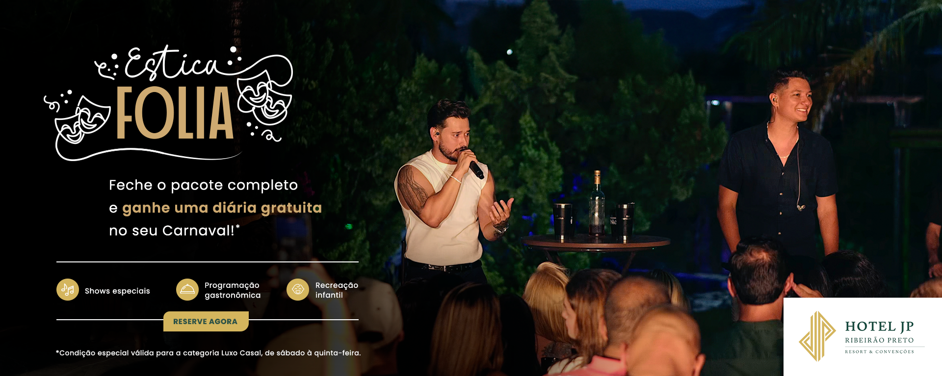 Descubra o Hotel JP Ribeirão Preto Resort & Convenções, o único resort da cidade, construído em uma área verde de 50 mil m². Ideal para momentos especiais em família, casal ou trabalho, oferece alto padrão de qualidade, lazer completo com quatro piscinas (climatizadas, infantil e bar molhado), quadras de tênis, beach tênis e futebol, saunas, jacuzzi, espaço kids, salas de jogos, massagens sob demanda e fitness center. Conta ainda com dois restaurantes de culinária nacional e internacional e um aconchegante american bar.