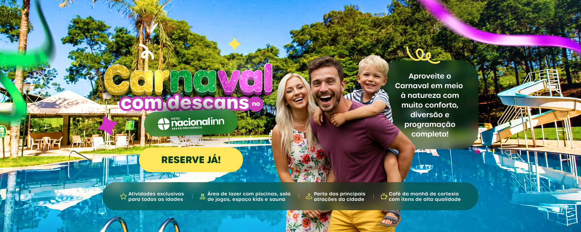 Com ambientes amplos, piscina, programação especial de Carnaval, café da manhã de cortesia, atendimento acolhedor e estrutura ideal para famílias, executivos e viajantes, o hotel oferece um equilíbrio perfeito entre lazer, conforto e contato com a natureza.