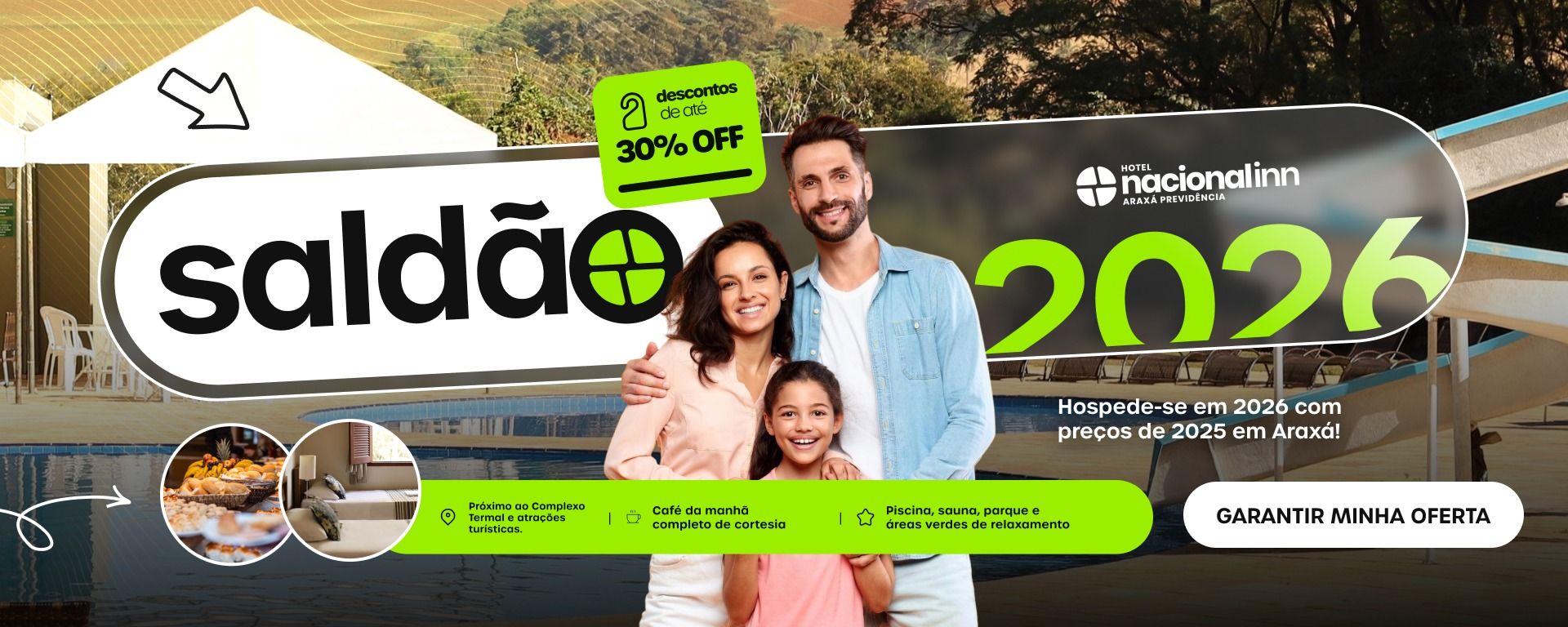 Viajar em 2026 ficou ainda melhor! Com o Saldão 2026, você garante sua estadia em Araxá com preços de 2025. Reserve com até 30% OFF e aproveite essa oportunidade única para planejar sua próxima viagem com economia e tranquilidade.