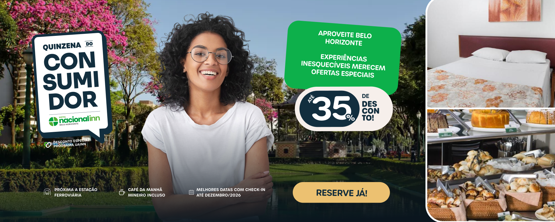 Durante a Quinzena do Consumidor, o Nacional Inn - Belo Horizonte oferece 32% OFF em todas as tarifas, com hospedagens até dezembro de 2026.