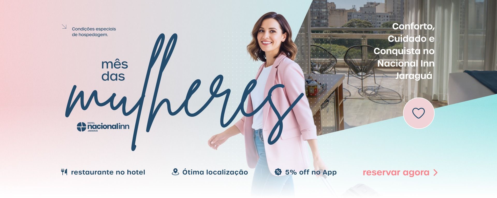 E no Nacional Inn Jaraguá, preparamos condições especiais para que elas vivam momentos de descanso, autocuidado e experiências únicas no coração de São Paulo.