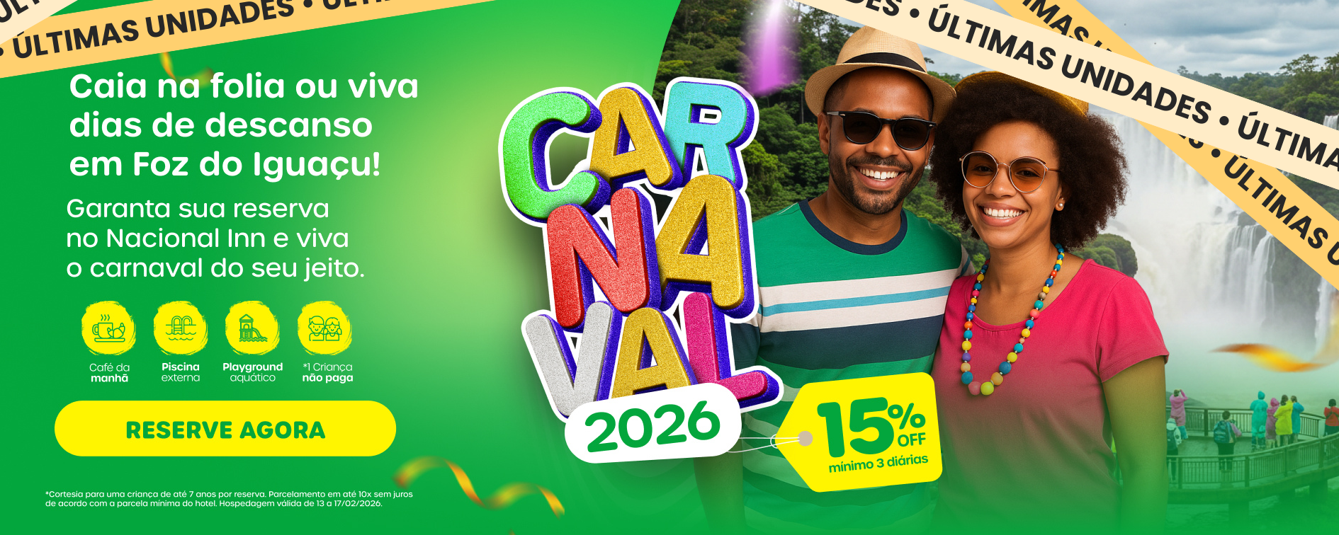 *Cortesia de hospedagem para uma criança de até 7 anos hospedada no quarto dos pais. Oferta válida para hospedagens de 13/02 a 17/02/2026, mínimo 3 diárias.