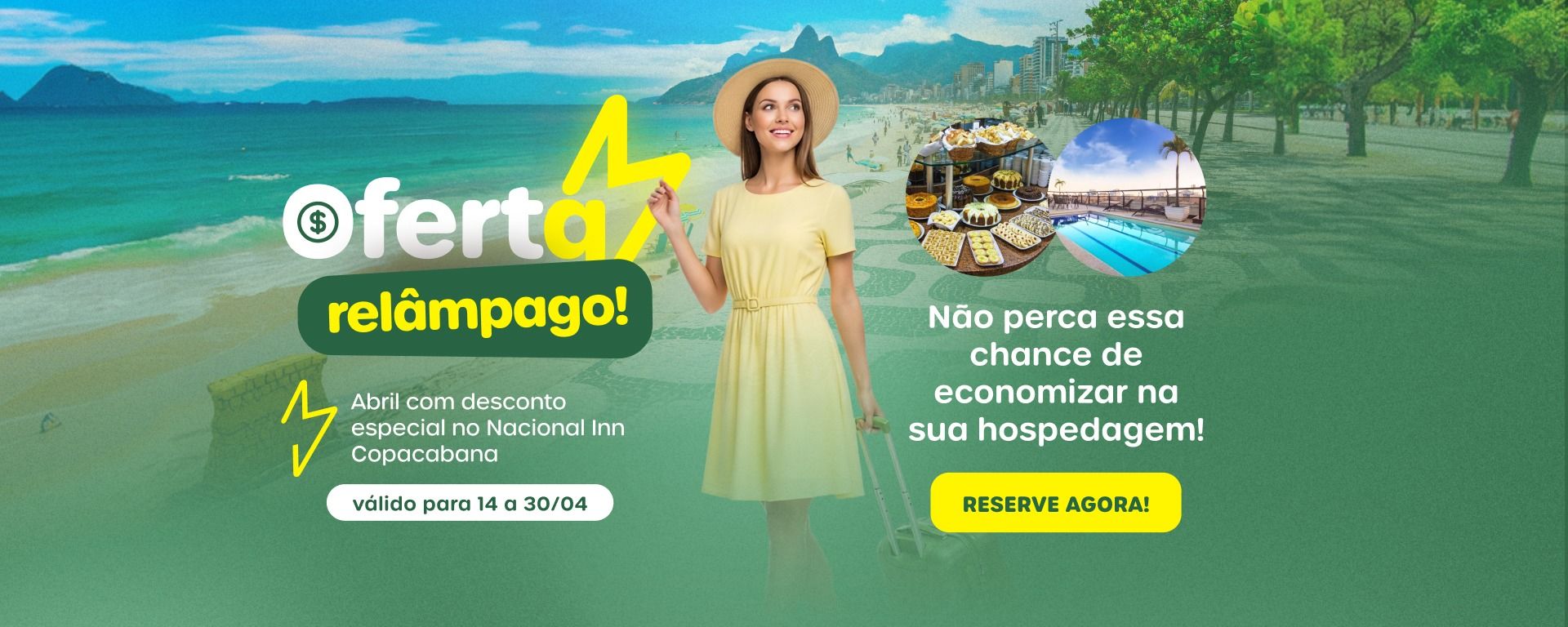 De 14 a 30 de abril, aproveite nossa oferta relâmpago para se hospedar em Copacabana, a poucos passos da praia mais famosa do Brasil.