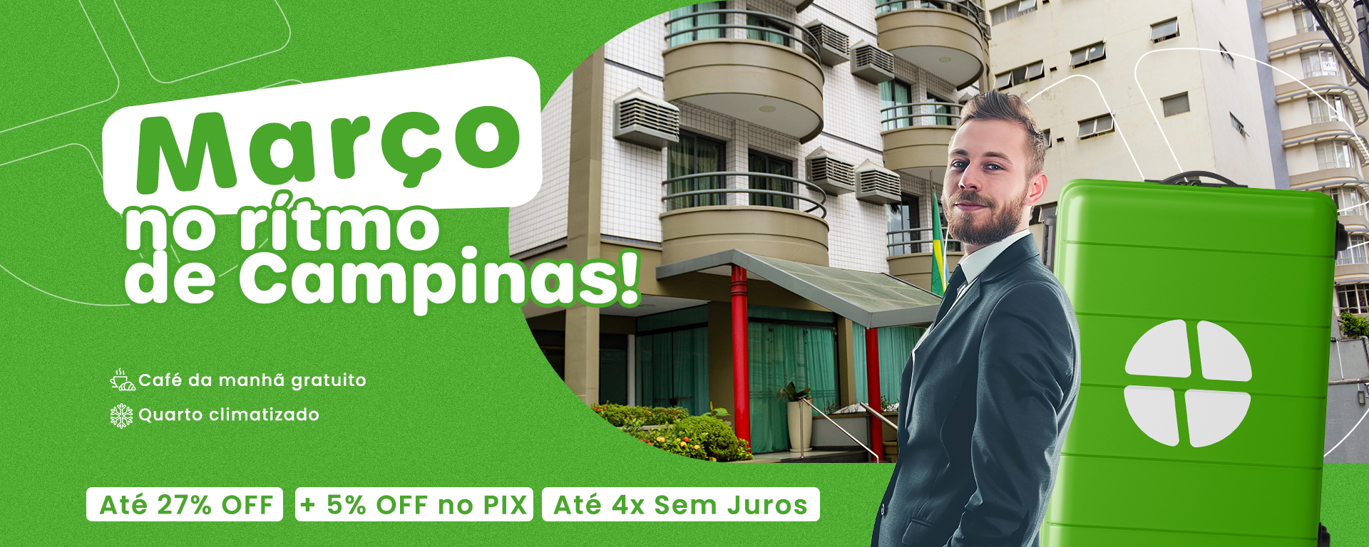 Garanta agora sua hospedagem em Campinas com descontos exclusivos e condições especiais válidas para compra com mínimo de 10 dias de antecedência.